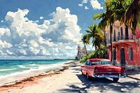 De Cubaanse strandscène ontvouwt zich in een harmonieuze compositie die de kijker meeneemt naar een wereld van stille melancholie en tijdloze schoonheid. Op de voorgrond staat een oude rode auto, waarvan de versleten carrosserie verhalen vertelt van vroegere reizen en avonturen. Hij staat geparkeerd op een strook wit zand dat zich zachtjes uitstrekt in de richting van de turkooisblauwe zee.