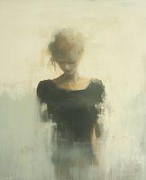 Dit abstracte schilderij toont de volledige vorm van een vrouw, vastgelegd in een betoverende, wazige en dromerige stijl. De vrouw is niet gedetailleerd, maar wordt gesuggereerd door subtiele, vloeiende lijnen en zachte, gedempte kleuren. De penseelstreken zijn expressief en los, wat een gevoel van beweging en emotie oproept, alsof ze…