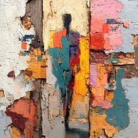 Een subtiel vrouwelijk silhouet komt tevoorschijn uit gelaagde abstracte texturen. Vervaagde kleuren en afbladderende oppervlakken creëren een gevoel van mysterie. De figuur voelt verborgen maar emotioneel aanwezig. Warme en gedempte tinten voegen diepte en sfeer toe. Dit kunstwerk mengt abstractie met een rustige menselijke expressie.
