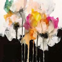 Abstracte en expressieve weergave van bloemen, geschilderd in levendige en zachte kleuren die tegen een contrasterende donkere achtergrond staan. De bloemen lijken te druipen en te vloeien, alsof ze smelten of langzaam vervagen in de achtergrond. De compositie gebruikt een breed palet van kleuren, waaronder roze, oranje, geel, wit en…