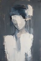 "Vervagende Identiteit" verbeeldt het geleidelijke verlies van een zelfbeeld, alsof de contouren van iemands bestaan langzaam oplossen in de leegte. De figuur in de afbeelding heeft geen duidelijke gelaatstrekken—het gezicht is gedeeltelijk bedekt door ruwe, expressieve penseelstreken van wit en grijs, terwijl de achtergrond met de schaduwrijke tonen van blauw en zwart een gevoel van verdwijnen oproept.
