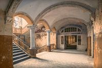 Een entree met trappenhuis in het verlaten Beelitz Heilstaten in het voormalige Oost Duitsland. Het hospitaal complex bestond uit 60 gebouwen, allen met een prachtige architectuur. Nadat de Russen zich in de jaren 90 hadden teruggetrokken raakte het complex al snel in verval.