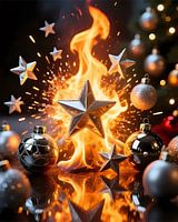 De foto vangt het dramatische moment van een kerstbal-explosie, waarbij de chaos van de versplinterende glazen ornamenten een fascinerende esthetiek ontvouwt. In een spectrum van levendige kleuren, waaronder felrood, sprankelend goud, diepgroen en stralend blauw, schieten de uiteenspattende kerstballen in verschillende richtingen. Hun…