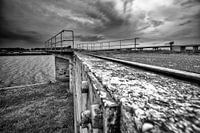 Oud en verlaten vintage aanlegsteiger langs de waterkant. Dreigende wolkenluchten boven Hollandse Delta. Urbex erfgoed in desolate staat met sfeervolle details en een diepte perspectief. Oude bouwwerken in de Noordoostpolder voor de inpoldering van Flevoland.