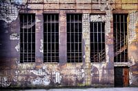 Vervallen muur met kapotte ramen van oud gebouw op vervallen fabrieksterrein