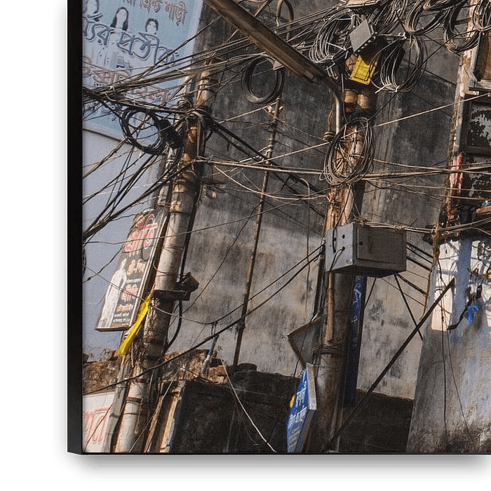 Dhaka is de hoofdstad van Bangladesh en staat met ruim 14 miljoen inwoners achtste in de top tien grootste steden ter wereld. Het oude centrum wordt Old Dhaka genoemd. Dit oude, afgebladderde pand in één van de smalle straatjes van dit oude centrum levert in combinatie met de rommelige elektriciteitskabels een prachtig grafisch plaatje…