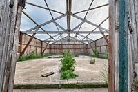 Urbex foto van een verlaten en vervallen schuur zonder dak, in de omgeving van Drunen en Waalwijk (Noord-Brabant). Het onkruid groeit tussen de scheuren in het beton. Het hout is verweerd. Allemaal ingrediënten voor de typische urbex-sfeer.
