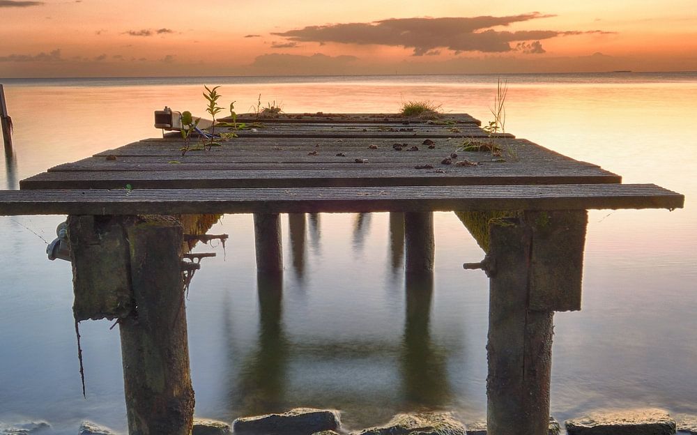 Vervallen steiger langs het IJsselmeer bij zonsopkomst