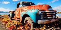 Een oude verweerde pick-up truck die stille getuige lijkt van een vervlogen era. Geplaatst tegen de achtergrond van een helderblauwe hemel en een meer, omgeven door de warme kleuren van herfstbladeren, ademt deze scène een gevoel van nostalgie uit.