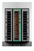 Een verlaten automateninstallatie bestaande uit drie verticale modules die ooit werden gebruikt om voedsel of kleine goederen te verkopen. De twee buitenste automaten zijn uitgevoerd in monochrome grijstinten, terwijl de middelste module opvalt met een vervaagde mintgroene kleur en licht verlichte compartimenten.