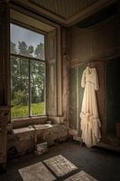 Foto van de binnenkant van een oude boerderij. In deze verlaten Groningse herenboerderij hangt een klassieke ivoorkleurige japon stil tegen een verweerde muur, als een tastbare herinnering aan een tijd die allang is vervlogen. Het zachte daglicht dat door het grote raam naar binnen valt, legt een warme gloed over de stof en benadrukt de…