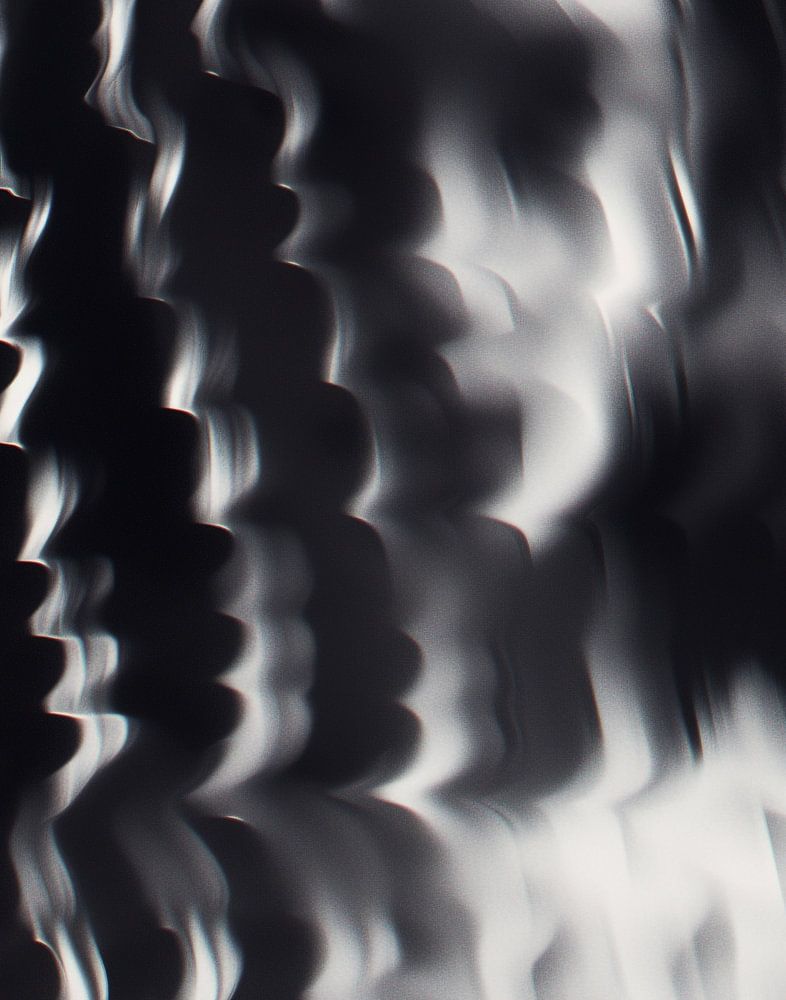 Dynamische abstractie van het menselijk portret, waar de contouren en gelaatstrekken lijken op te gaan in een vloeiende beweging van licht en schaduw. De afbeelding is gedomineerd door een monochromatisch kleurenpalet, waarbij de nadruk ligt op de gradaties van zwart, wit en de nuances daartussen. Het gezicht op de voorgrond is niet statisch maar lijkt door een soort vervorming of beweging te zijn beïnvloed, wat een gevoel van transformatie of vervaging van de identiteit oproept. Deze vervorming kan wijzen op de vluchtigheid en veranderlijkheid van de menselijke natuur.
