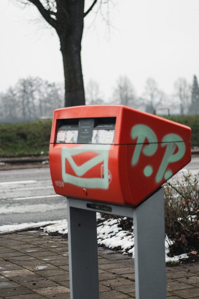 Dit beeld toont een postbus in een rustige stadsomgeving, met graffiti die de functionaliteit van het object lijkt te ondermijnen. Het felrode metaal van de postbus steekt af tegen het grijze, sneeuwachtige landschap, wat een sterk visueel contrast vormt. De graffiti, met de letters "P.P.", geeft het alledaagse object een onverwachte flair, maar roept tegelijkertijd vragen op over de veranderende rol van traditionele postdiensten in een steeds digitaler wordende wereld.