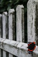Verweerd hek met zwarte vlinder. De foto heeft een mooi diepte-effect door het 'weglopen' van het hek. De kleuren van de vlinder fleuren deze sombere foto op.