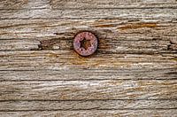 Schoonheid zit soms in de details. Bij deze close-up van een bankje in een park zijn het de subtiele kleurovergangen tussen bruin, beige en lichtgrijs en het lijnenspel van horizontale strepen, groeven en splinters. De roestige schroef met zespuntige insnede maakt het beeld af.