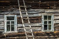 De voorgevel van een verweerd en verlaten houten huis met twee verweerde ramen en een ladder in Wit Rusland