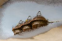 Staal en corrosie. Het onderwerp, 3 koepels van een staalfabriek, wordt weerspiegeld in een regenplas. Omdat de foto in de plas is genomen, stond het beeld oorspronkelijk op zijn kop. Om het spannender te maken, is het omgedraaid zodat je er recht op kijkt. Een lichte rimpeling in het regenwater brengt subtiele beweging in een gedeelte…