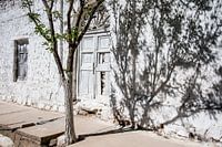 Verweerd Argentijns witgepleisterd huis met een oude houten deur en raam, subtiel omlijst door het spel van schaduwen van een boom. De combinatie van licht, textuur en contrast creëert een serene en tijdloze uitstraling. Een poëtisch beeld dat perfect past in thema’s zoals vergankelijkheid, stilte, authenticiteit en minimalistische esthetiek.