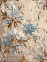 In dit kunstwerk vloeien zachte blauwtinten samen met warme aardse nuances op een verweerde, gelaagde achtergrond. De bloemen lijken deels opgelost in de textuur van het doek, waardoor een subtiel samenspel ontstaat tussen abstractie en figuratie.
