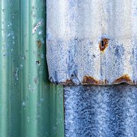 Deze foto toont een close-up van verweerde, gegolfde metalen platen. De platen vertonen tekenen van roest en corrosie, met een mix van groene en blauwgrijze tinten. De textuur en kleurvariaties maken het een interessant beeld voor abstracte kunstfotografie.