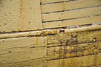 Fragment van een verweerde houten scheepsromp, met geel geverfde houten planken in verschillende maten, van een oude IJslandse vissersboot.