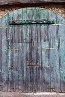 Verweerde groene deur op boerenerf met bruine, roestige bouten en sloten en verweerde groene verf op de houten planken