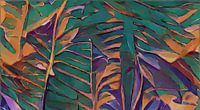 Herfstbladeren die deels of helemaal verweerd zijn. Bij sommige bladeren is nog wat blad te zien, terwijl bij anderen een paar nerven nog zichtbaar zijn. In rijke kleuren: donker emerald groen, schakeringen oranje, terracotta en paars-blauw.