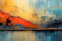 Levendige oranje en blauwe tinten gaan naadloos over in abstracte vormen en creëren een dynamisch contrast dat de essentie oproept van een dramatische, verweerde muurtextuur. Fijne lijnen en getextureerde elementen voegen diepte toe en versterken het gevoel van beweging en stroming in de compositie.