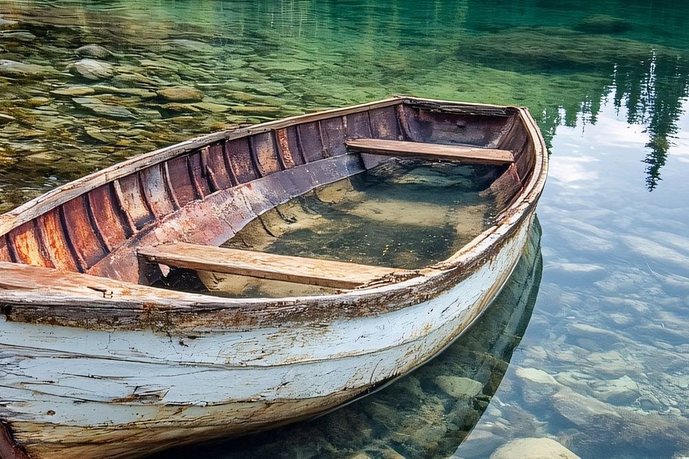 Dit prachtige ontwerp toont een verweerde, verlaten roeiboot die stil in het kristalheldere water ligt. De omgeving is een serene oase, omringd door rotsen en een bosrijke achtergrond met groene bomen. De weerspiegeling in het water en de gedetailleerde kleuren van de boot en natuur geven een rustgevend effect. Dit beeld roept gevoelens op van eenzaamheid en tijdloosheid, alsof de boot al jaren in deze stille baai ligt te wachten. Perfect voor iedereen die houdt van rustieke schoonheid en natuurlijke elementen in hun interieur.