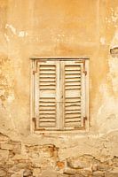 Oude verweerde en scheve shutters in een oud gebouw in Monticello d'Alba in Italië. Een hoop gebouwen zijn picobello in orde maar af en toe in een zijstraat zie je dan deze muur met shutters. Prachtig verweerd met los stucwerk.