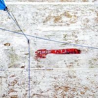 Als abstracte kunstfotograaf ben ik altijd op zoek naar de verborgen schoonheid in het alledaagse. Dit werk toont een close-up van de verweerde houten planken en afbladderende verf van een oud strandhuisje op Texel. De combinatie van natuurlijke verwering en de blauwe touwen die door het beeld lopen, voegt een onverwachte geometrische dimensie toe die contrasteert met de organische texturen van het hout.