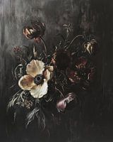 Dit intrigerende kunstwerk vangt de melancholie van verwelkte bloemen in een dramatisch clair-obscur. De verfijnde penseelstreken en donkere, fluwelen achtergrond doen denken aan Hollandse meesters, terwijl het onderwerp – vergankelijkheid en schoonheid in verval – een moderne, poëtische kracht uitstraalt. Perfect voor wie houdt van stille intensiteit, klassieke elegantie en een vleug mysterie aan de muur.