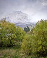 Een schilderachtig landschap van bomen en nevelige bergen in Nieuw-Zeeland
