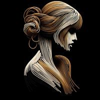 Een elegant portret van een vrouw in profiel, met opgestoken bruin haar, gevormd uit touw. De zachte lijnen en texturen van het haar worden prachtig geaccentueerd door een diepe zwarte achtergrond, die het silhouet van haar gezicht en haar verweven schoonheid benadrukt. Het werk straalt verfijning en een rustige kracht uit.