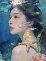 Deze jonge vrouw is weergegeven in profiel, net onder het wateroppervlak. Het licht weerkaatst op haar huid en schouder. Een zeester rust zichtbaar op haar schouder terwijl vissen langs haar gezicht zwemmen.