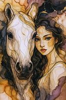 In zachte lijnen van vloeibaar goud ontmoeten mens en dier elkaar in stilte. Hun blikken spiegelen dezelfde diepte – een geheim gedeeld zonder woorden, een kracht die ademt tussen huid en vacht. De vrouw en het paard vloeien samen, als één ademtocht, één ziel in twee gestalten. Het is een portret van verbondenheid, van het onzichtbare koord dat de mens met de natuur verbindt, bezongen in de taal van kleur en lijn.