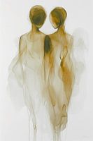 Twee figuren die dicht bij elkaar staan, hun contouren vervagend in een warme, bruine tint. De figuren lijken met elkaar verweven door een spel van vloeiende lijnen en transparantie, waardoor een gevoel van intimiteit en nabijheid ontstaat. De bruine tinten, variërend van diep donkerbruin tot lichter beige, geven het werk een aards en warm gevoel, wat contrasteert met de etherische aard van de figuren zelf. Deze kleurenkeuze kan suggereren dat het werk thema's van verbinding, menselijkheid en aardse aanwezigheid verkent.