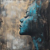 Verweven met de Tijd is een krachtig en introspectief kunstwerk dat de verbinding tussen verleden, heden en toekomst weerspiegelt. De zijwaartse blik van de vrouw, met haar ogen gesloten en haar gezicht subtiel gehuld in een sluier van blauwe en gouden accenten, straalt een diepe sereniteit uit. Alsof ze zich overgeeft aan de stroming van tijd en herinneringen, balancerend tussen vergankelijkheid en transformatie.