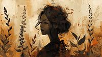 Een expressief portret met plantensilhouetten en warme beige en okertinten. Kunstig abstract en zeer decoratief.