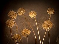 Gelaagd beeld van gedroogde bloemschermen, waarin licht, vorm en schaduw samenvloeien tot een zachte herinnering aan vergankelijkheid.
