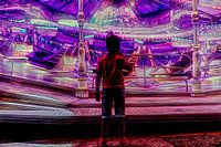 In verwondering van kleur, licht en snelheid staat het kind het schouwspel te aanschouwen.