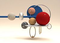 Driedimensionaal (3D) ontwerp van een verzameling van vormen (bal, ring, schijf, cilinder) in diverse materialen (papier, textiel, plastic, marmer, metaal) en kleuren (rood, blauw, bruin, beige, wit). Zie ook Verzameling van vorm 1 om een naadloos tweeluik te vormen.