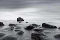 Zwart-wit foto met grote stenen aan het strand van de Oostzee, de beweging van het water en de wolken werd afgevlakt door langdurige belichting, het beeld straalt veel rust uit - Locatie: Duitsland, Oostzee, eiland Rügen, Lohme