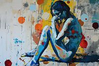 Verzonken in Blauw - Dit expressieve stuk vangt de essentie van stedelijke kunst, met een vrouw in blauw - feeling blue. Onvolmaakte, gedurfde penseelstreken vermengen zich met spatten en druipende verf, terwijl een palet van blauwtinten en opvallende accenten in oranje en rood de scene levenskracht geven. Het is rauw, emotioneel en toch harmonieus.