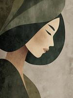 gestileerd zijprofiel van een vrouw, weergegeven in een palet van diepe groentinten (kleur), beige en warme aardetonen. De figuur straalt sereniteit en ingetogen kracht uit. Het geometrisch vereenvoudigde gezicht en de soepele lijnen van het haar en de kleding doen denken aan art deco- en minimalistische invloeden.