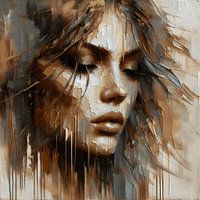 Een vrouw met weelderig haar omgeven door een zachte mix van beige, bruin en gouden tonen. Haar aanwezigheid is stil maar krachtig, alsof ze haar verhaal fluistert in schaduwen en licht. De warme kleuren brengen een gevoel van rust, terwijl de diepte van het werk haar mysterieuze aanwezigheid versterkt. De combinatie van licht en…