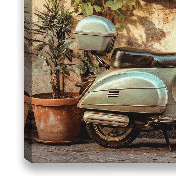 Een delicaat beeld van stedelijke sereniteit: een charmante Vespa leunt tegen een muur, omlijst door weelderig groen en bloeiende bloemen. Het zachte mintgroen van het oppervlak van de scooter harmonieert perfect met de vintage luiken, terwijl de warme tinten van de potten een gevoel van thuis en het nostalgische Italië oproepen. Een…