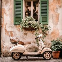 Een charmante foto die de romantische sfeer van een Italiaans steegje vastlegt. De delicate groene luiken harmoniëren perfect met de bloeiende vensterbank. Een nostalgische scooter, licht verouderd, wacht geduldig op kleine avonturen, terwijl de natuurlijke patina van de muur verhalen van vervlogen tijden fluistert. Een plek die…