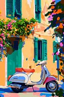 In een zachte harmonie van kleuren straalt het landschap mediterrane flair uit. Een charmante Vespa staat stijlvol geparkeerd voor een felgeel gebouw, waarvan de groene luiken en bloeiende planten een levendig contrast vormen. De warme sfeer nodigt je uit om te ontspannen en te genieten van de liefde voor de Italiaanse manier van leven.