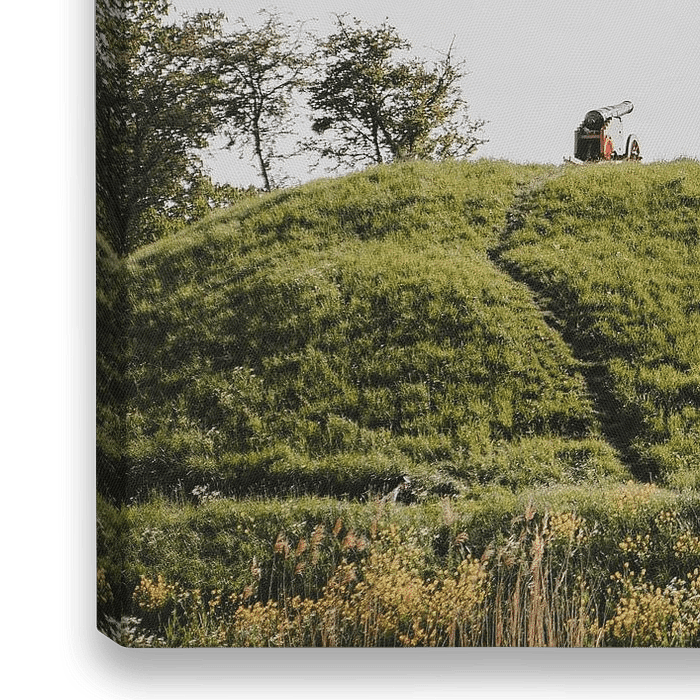 Deze foto toont een historisch verdedigingswerk in Gorinchem, met een kanon op een met gras begroeide heuvel. Gele koolzaadbloemen en groene bomen omlijsten het landschap, terwijl een wandelpad door het vestinggebied slingert. De vestingstad Gorinchem is onderdeel van de Hollandse Waterlinie en biedt een mix van historie en natuur,…